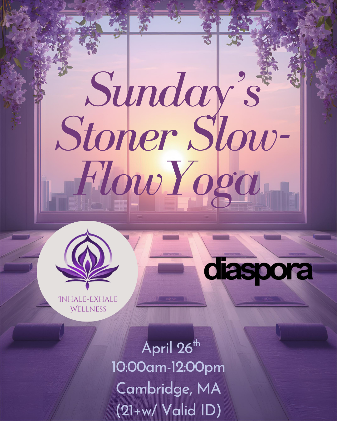Unwind after NECANN with Sunday’s Stoner Slow‑Flow — a grounding, cannabis‑friendly yoga session at Diaspora, a private 21+ club in Cambridge. This slow, intentional flow blends movement, breathwork, and relaxation, creating the perfect reset after a busy convention weekend. This class is welcome to all 21+ guests. Let’s smoke some green and unwind on a beautiful Sunday morning!